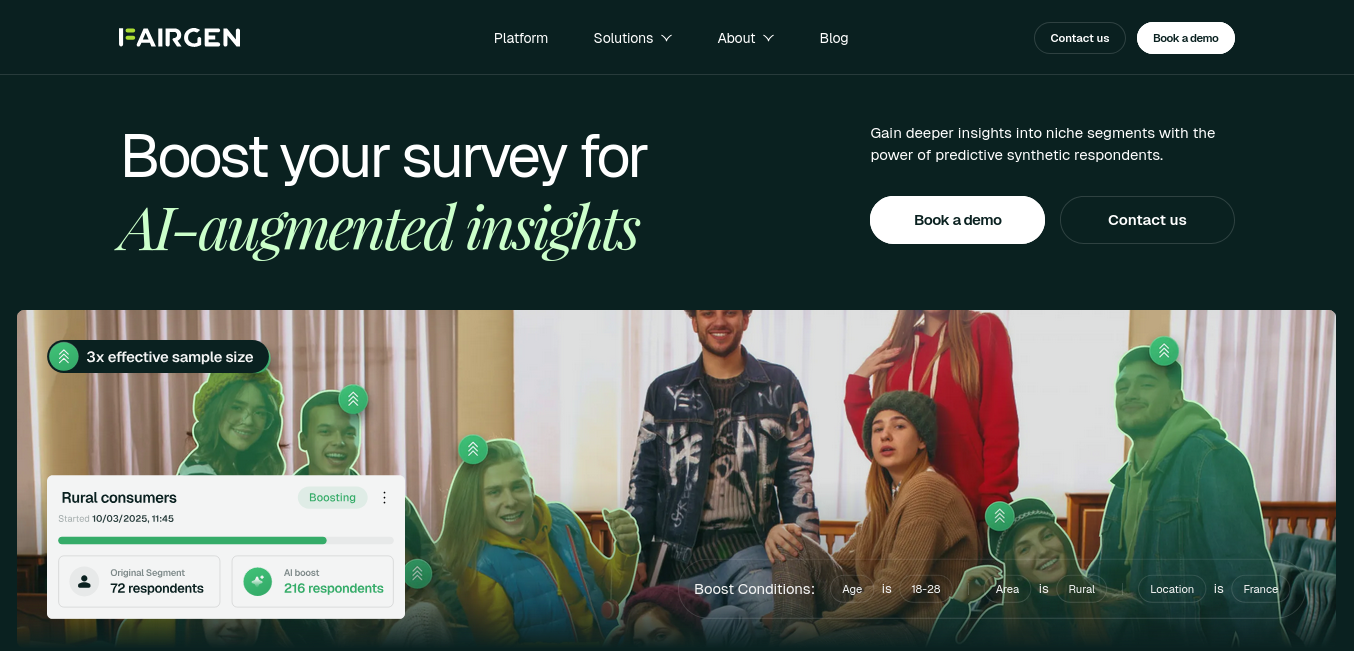 Fairgen empowers researchers with AI and synthetic data tools to extend surveys, boost niche respondents, detect fraud, and track brand equity, delivering deeper, faster, more trusted insights.